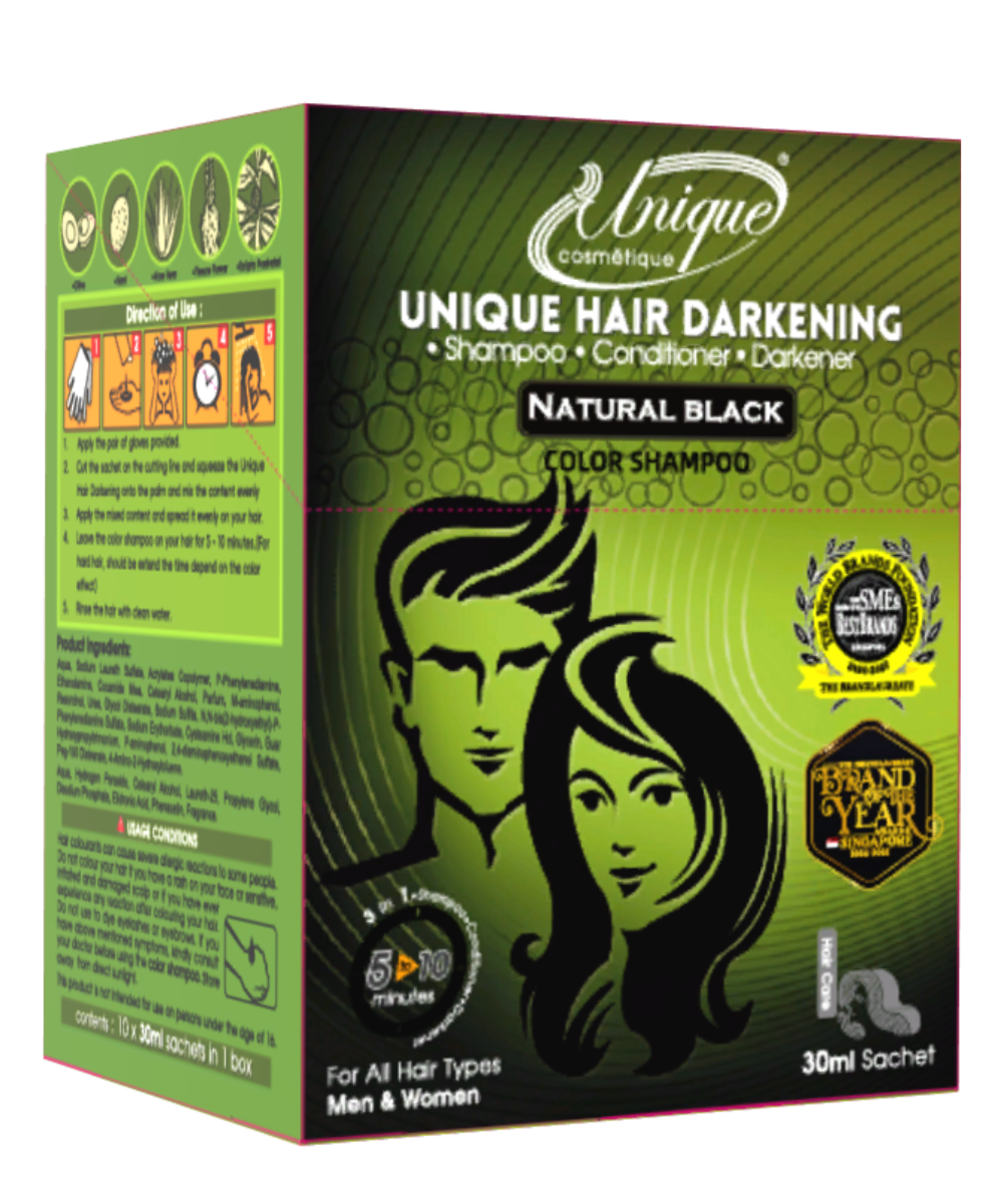 The Unique Hair Darkening penetrates deep into the hair roots to darken the hair quickly and effectively.The triple action formula acts as conditioner,shampoo and hair darkener.Unique Hair Darkening provides shiny and silky smooth black hair.It can provide the safest color shampoo experience.
